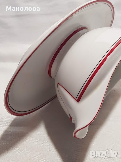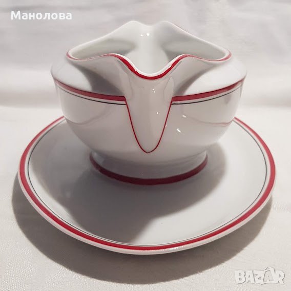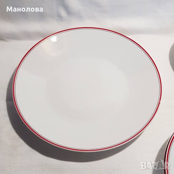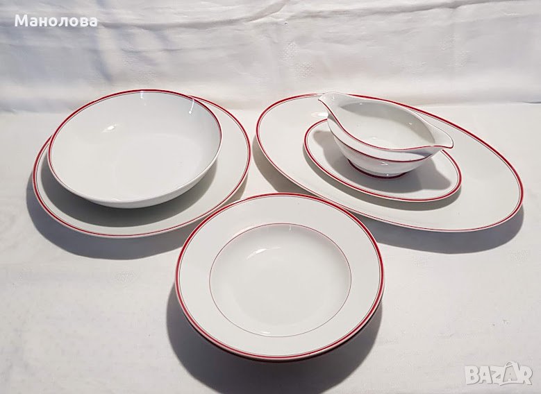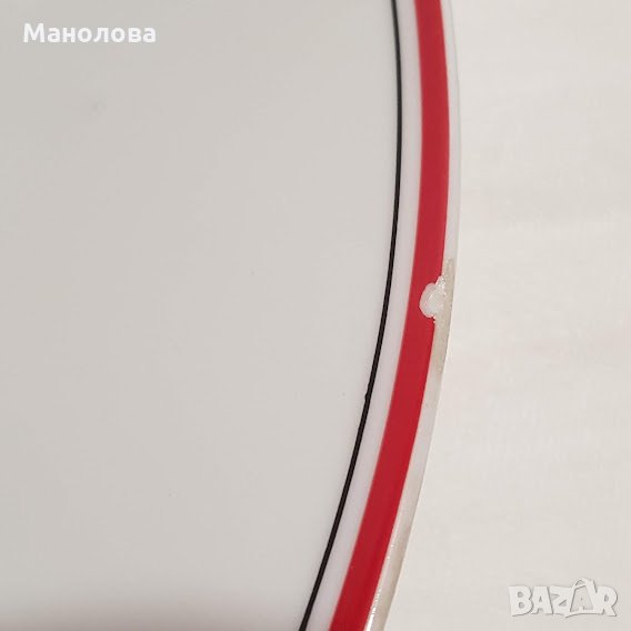 Млечно бяло, червен по широк кант и тънък черен кант. В прекрасно ретро състояние/неразличими от нови, явно е че не са били ползвани никога/, само на кръглото плато има малък чип-моля разгледайте снимките! Идеално допълнение към всеки изчистен ваш сервиз в бяло или червено!