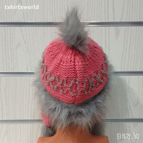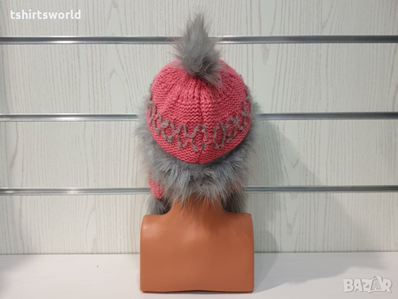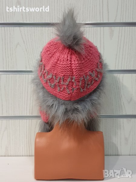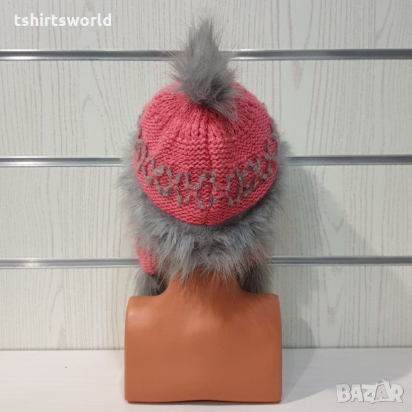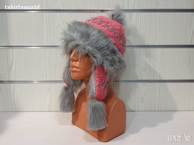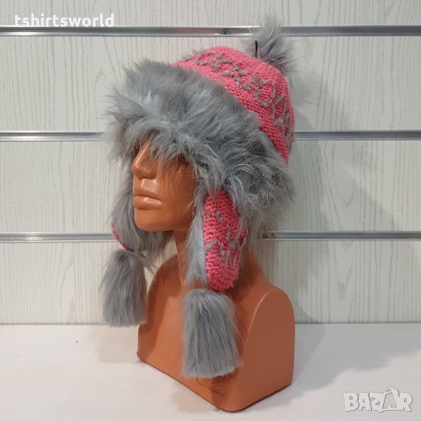 Уникална, функционална, универсална, стилна и модерна нова зимна дамска пухкава шапка с помпон/пух, тип ушанка в розов цвят.