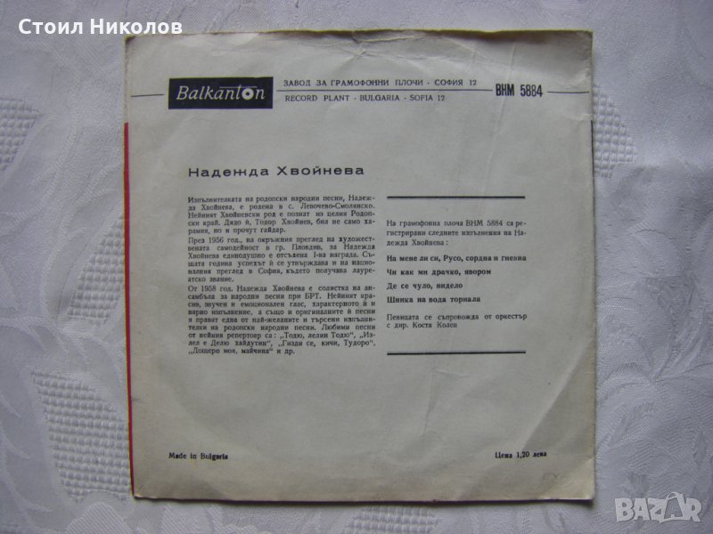 На грамофонна плоча ВНМ 5884 са регистрирани следните изпълнения на Надежда Хвойнева: