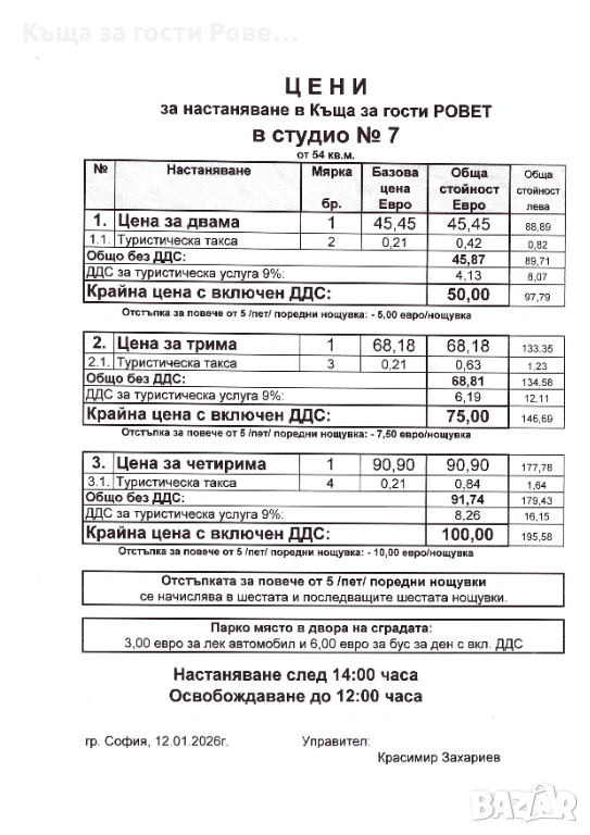 0,21 евро и ДДС за туристическа услуга в размер на 9%. Нощувките и почивките се