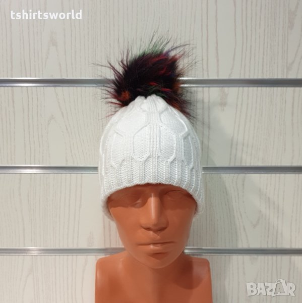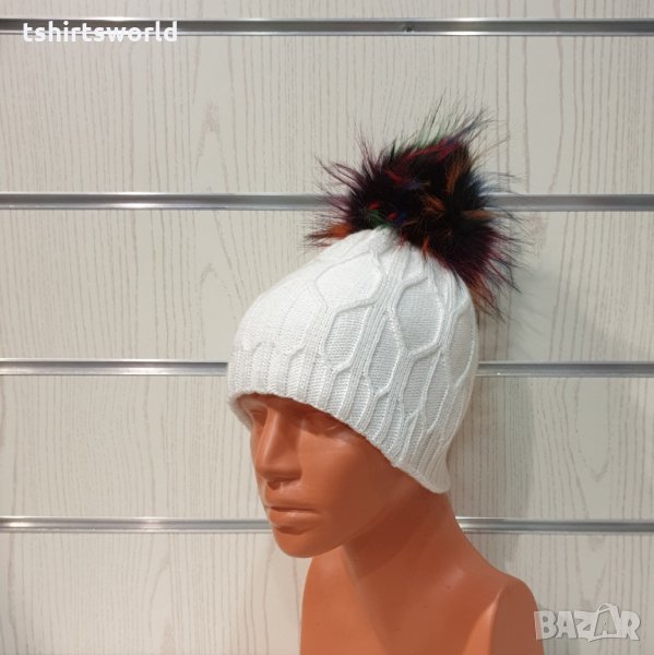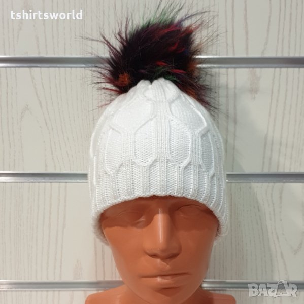 Нова зимна дамска бяла шапка с шарен помпон/пух → Обява 35478437