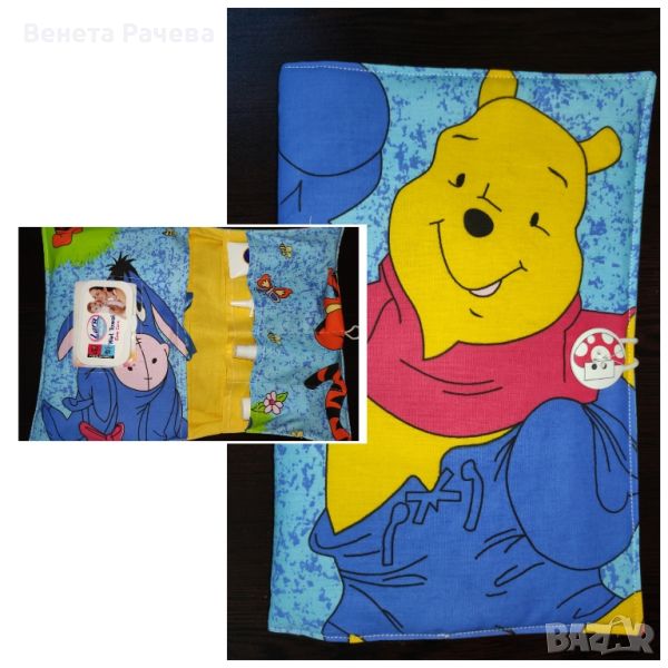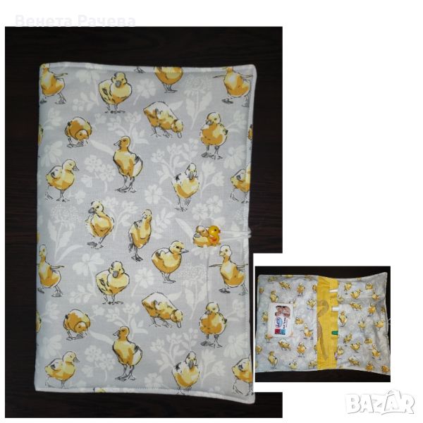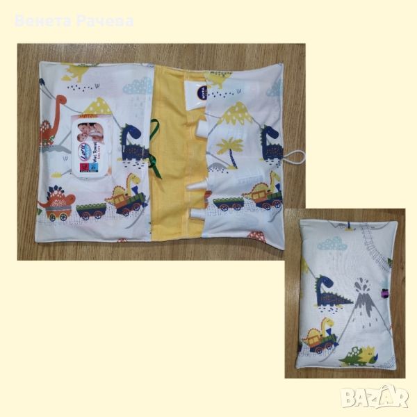 Бебешки несесер за памперси, кърпички и всичко необходимо за разходката на бебчо.За да е всичко под ръка на мама за комфорта на малкото човече. Мек памучен плат, подплатен с вата и закопчаване с тънко ластиче. Спокойно може да събере голям пакет мокри кърпички и няколко памперса. С място за кремче,капки и още нещо. С възможност за персонализация с машинна бродерия