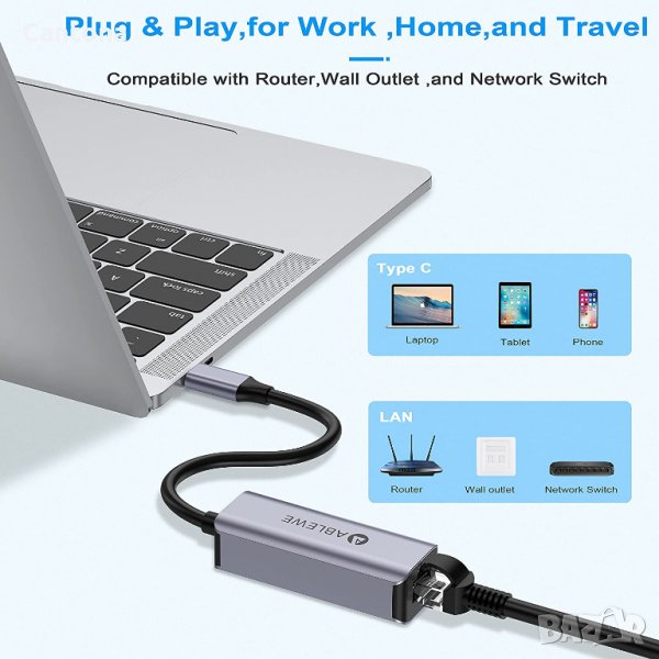 ABLEWE Type-C към RJ45 Gigabit Ethernet адаптер, Thunderbolt 3