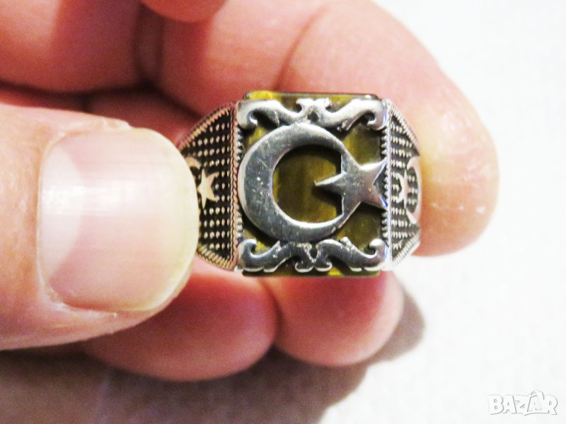 мъжки сребърен пръстен с ГОЛЯМ полумесецът и звездата, турски пръстен, османски пръстен, турция, флага на Турция .