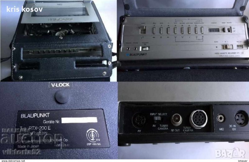 Система VHS PAL, директно задвижване, кварцово заключване, топладер, механ. лента брояч с памет, микрофон.-, рем. и жак за телефон, терминали за DIN-AV, камера и вътрешен. Захранване 12 V, бат. метър, вграден RF модулатор.Модел: Преносим видеокасетофон RTX-200 / 7 618 022 - Blaupunkt, Япония,много рядък видио касетофон 1969 г в оргинална кожена чанта
