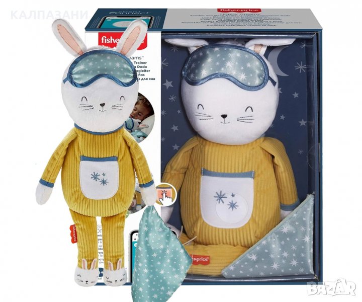 Успокояващото зайче Fisher-Price® Hoppy Dreams ™ е пухкава плюшена играчка, която помага за успокояване на малките деца с одобрен от експерта по сън плейлист с успокояваща музика и звуци. За да помогне с тренировките за сън, коремът на зайчето светва в различни цветове, които дават на децата да разберат кога е време за сън и кога е добре да се събудят и да скочат в приключенията на новия ден. Удобното приложение Smart Connect ™ ви позволява да персонализирате и контролирате всички настройки, без да нарушавате съня си.