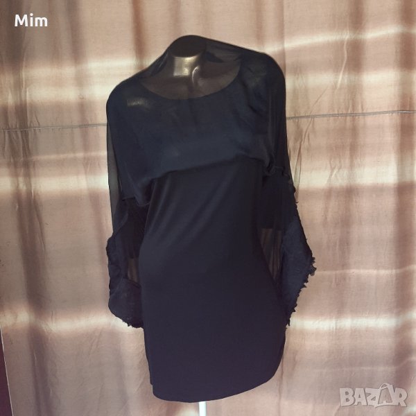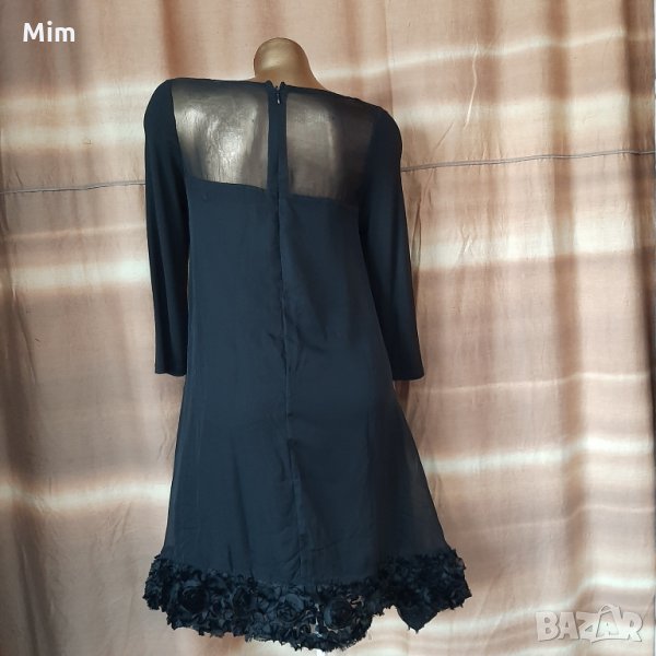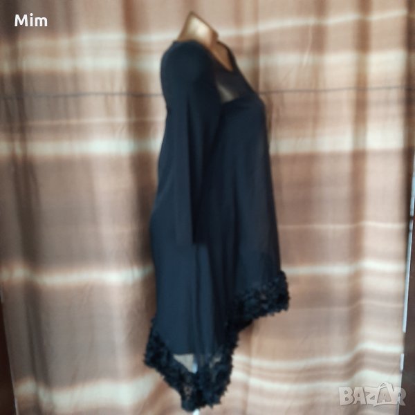 Черна рокля от меко трико ,отгоре има черен прозрачен воал от долу е раздвижена със зашити рози .с дълъг ръкав закопчаването е отзад с цип. Под мишниници 45 см едностранно талия42 см едностранно ханш 47 см едностранно еластичност 10.см ,горният воал е разкроено силно ,рамене 35 см едностранно