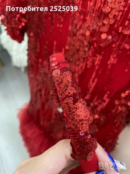 Елегантна семпла рокля от ситни пайети в алено червено разпръснати върху мрежа в червено, закупена от Salzarra. Роклята е с къси ръкавчета, с трапецовиден силует, закопчава се с цип на гърба. Долната част е раздвижена с къдрици от мек тюл също в червено. Роклята е с мек еластичен хастар.