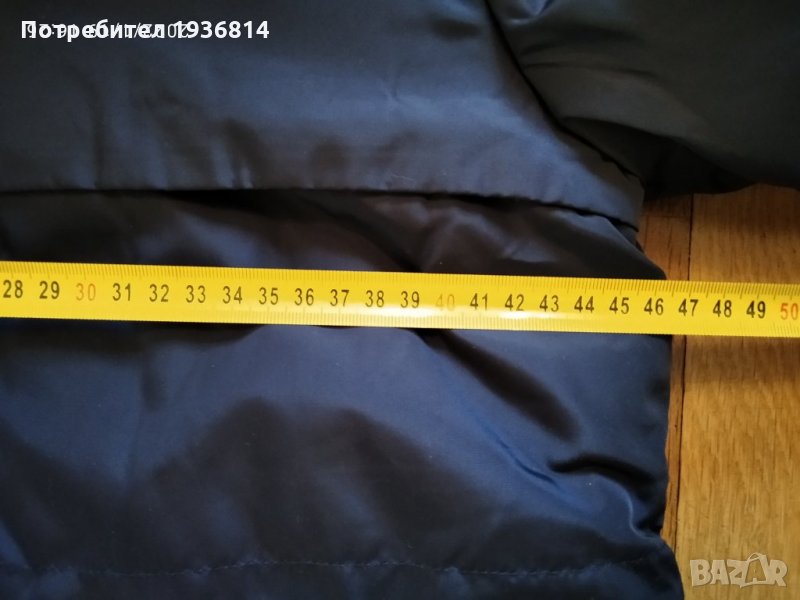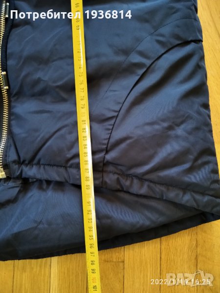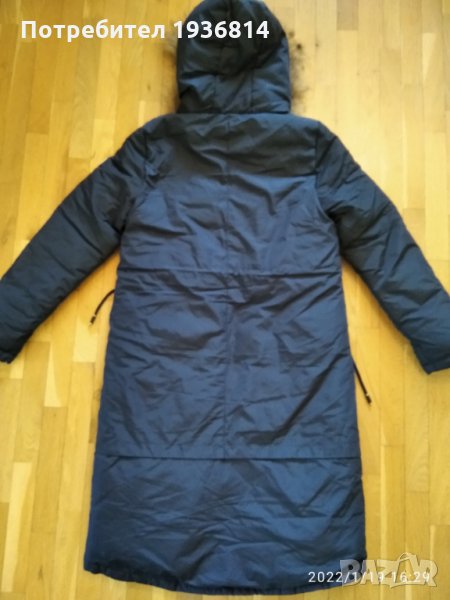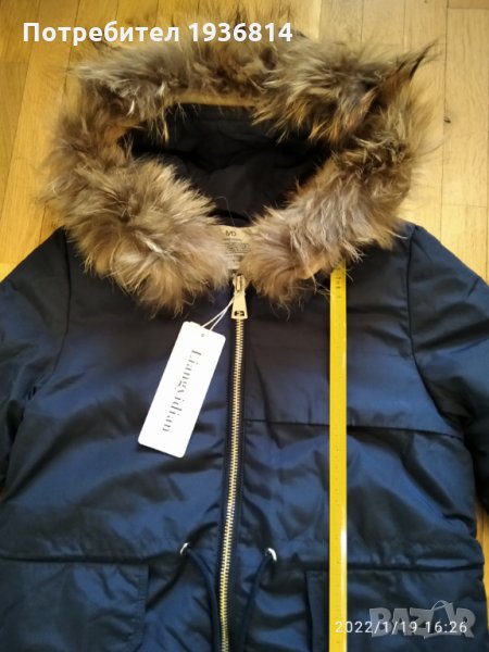 Ново яке, с етикет. Качулка с естествен косъм. Пише размер Л, но отговаря на С или М. Тъмно син цвят.