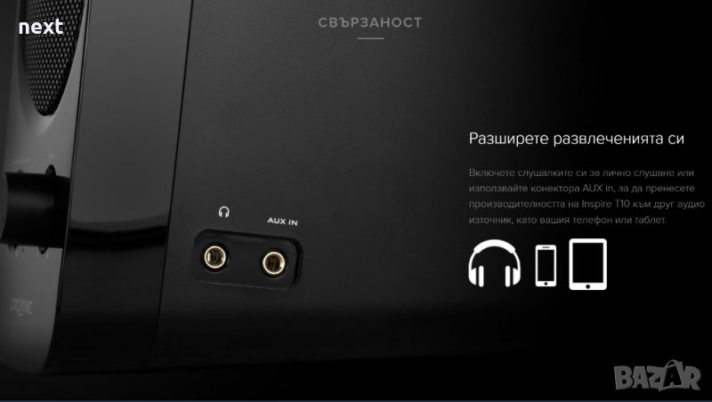 Включете слушалките си за лично слушане или използвайте конектора AUX in, за да пренесете производителността на Inspire T10 към друг аудио източник, като вашия телефон или таблет.