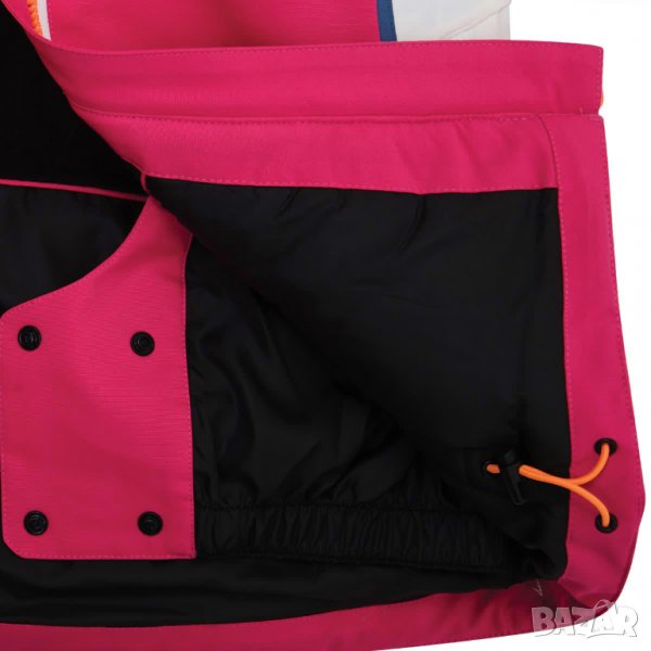 Качулка с регулиране с едно дръпване. Блокиращата снега пола със силиконова лента и регулируемите маншети на ръкавите, запечатват топлината от вътрешната страна на дрехата. Множество джобове, включително един за вашата ски карта. Централен цип завършващ с предпазител против нараняването на брадичката.