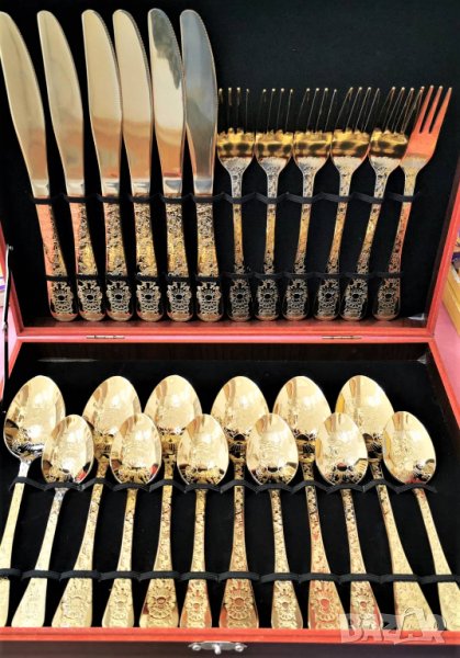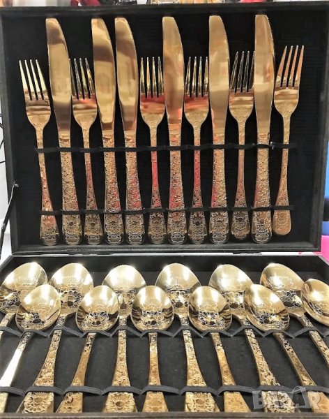 Уникални, гравирани, златни прибори за хранене - 24 части изработени от висококачествена стомана с непроменящ се цвят злато.