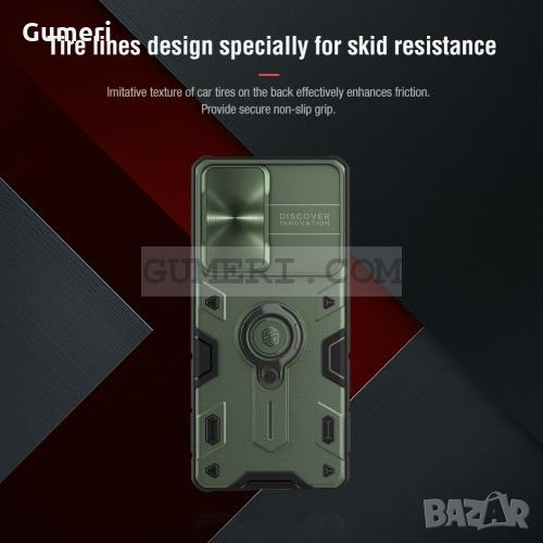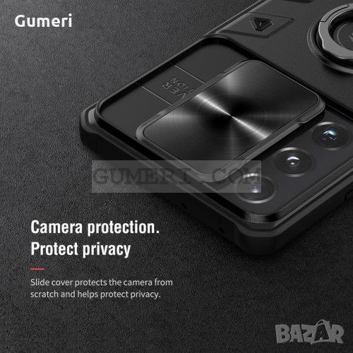 Хибриден предпазен гръб от висококачествен твърд и мек материал с метален пръстен и плъзгащо се задно капаче за защита на задната камера.