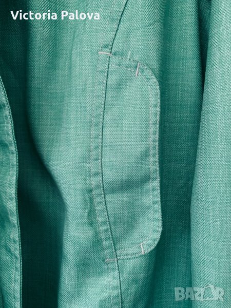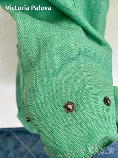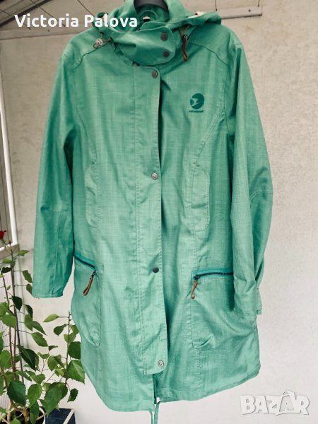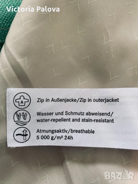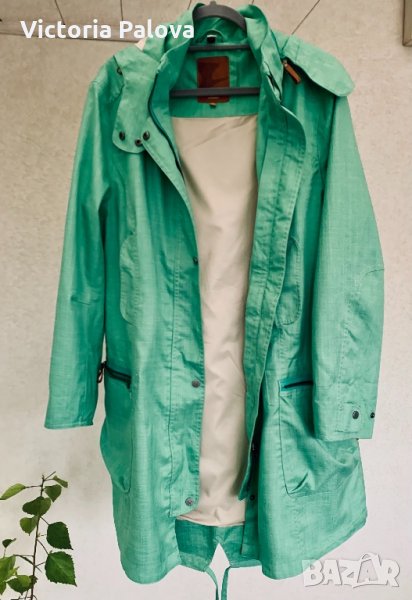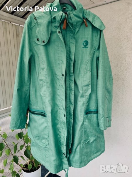 Скъпа марка,много красиво яке с много суперлативи-два джоба с цип,горе два вътрешни,вътре един,три позиции за свиване на ръкава,вътрешна регулираща връв по линия на талия и долу,откопчаваща се качулка с интересна красива козирка,два ципа отпред за закопчаване,непромокаема материя,която не се мърси,подплатата е с логото на марката,красив цвят айсберг,хубава удобна кройка.рамене-46см,ГО-62см,дължина-103см,ръкав-64см.