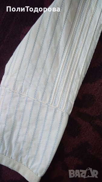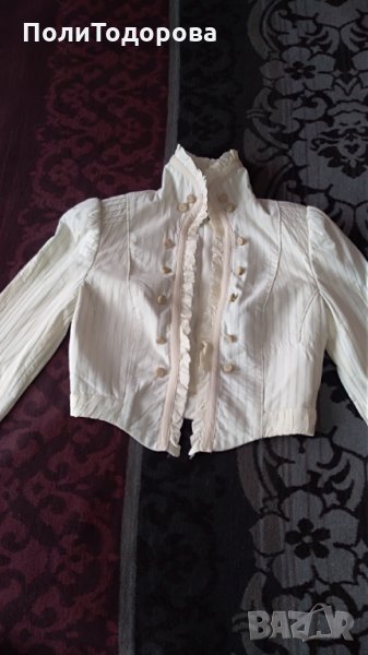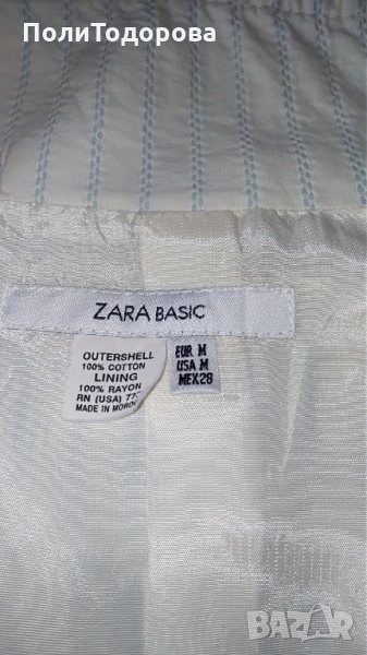 Късо дамско сако ZARA. Цвят шампанско с бледо синьо райе, чист памук. Размер M, но одговаря на XS. Рамене 35см. Дължина 40см.