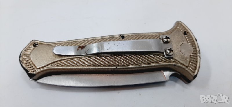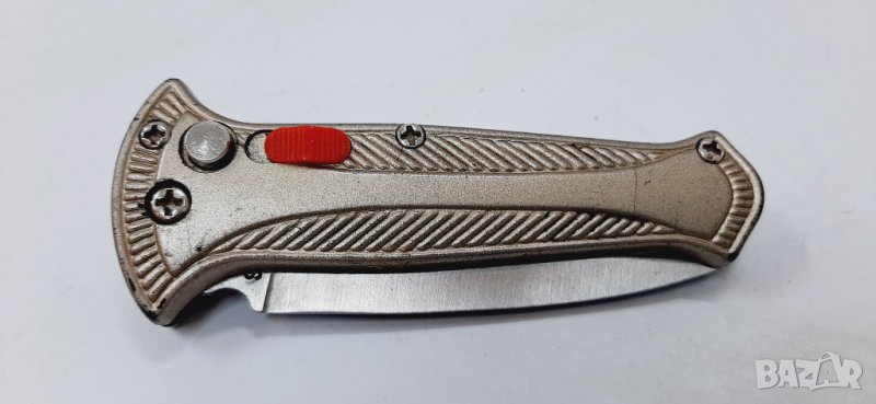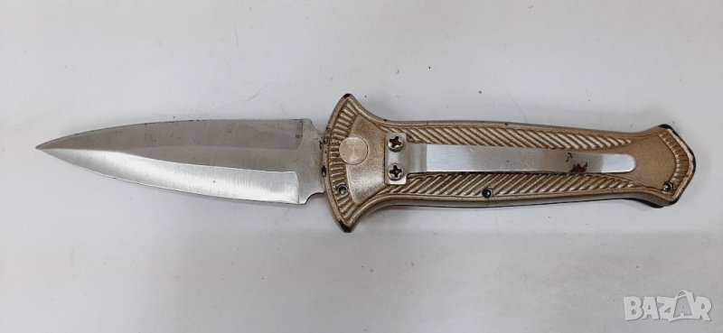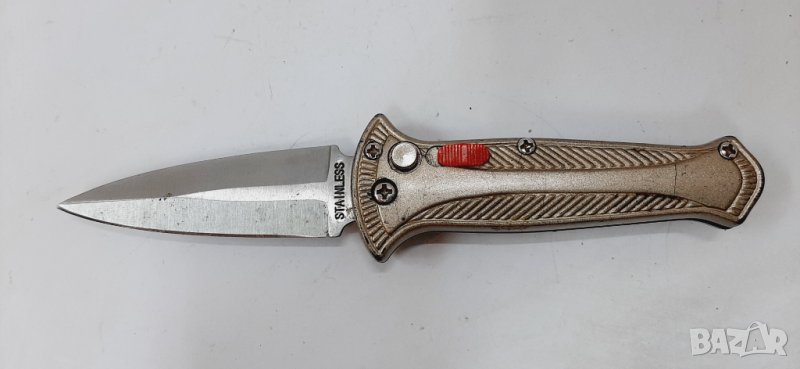 Автоматичен нож, произведен около 90-те години на миналия век. Острие от неръждаема стомана с бластиране (най-вероятно 440C) и анодизирани алуминиеви дръжки. Острието функционира както трябва и се заключва като се отваря и затваря с бутона. Има оригинален фабричен ръб. Идва без кутия.