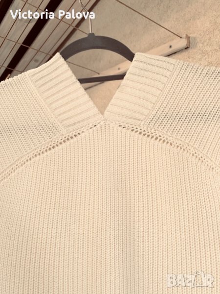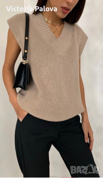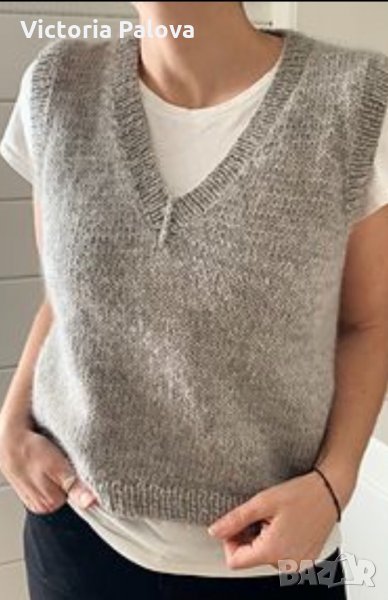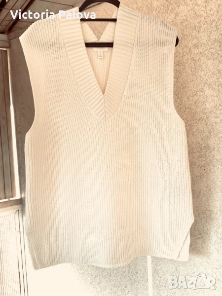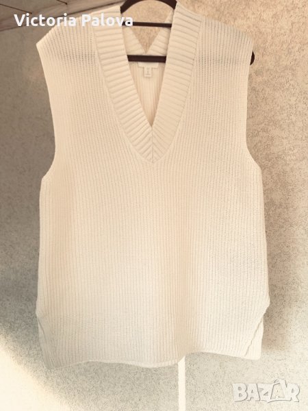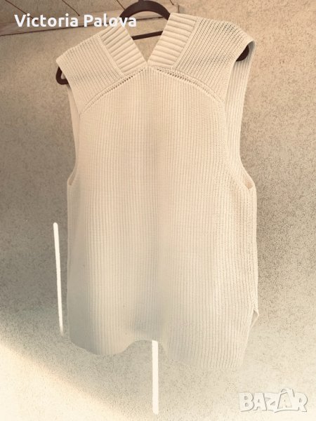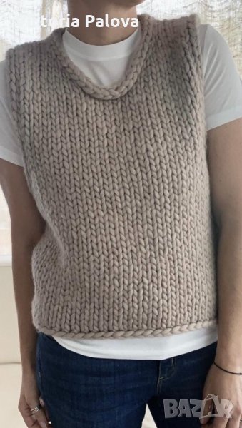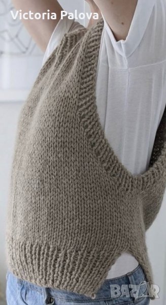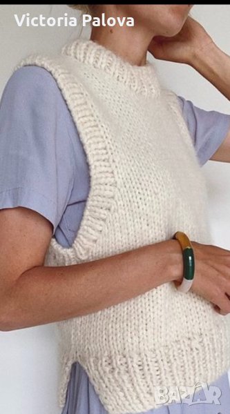 Памук и акрил,едра плетка,V-образно деколте,две скосени цепки.ГО-53см дължина-73см,цвят екрю млечен или айвъри.лесно се поддържа,неизползвана.тренд за пролетта и лятото,ще се носи именно така,както е показано на снимките-върху тениска или на голо тяло.