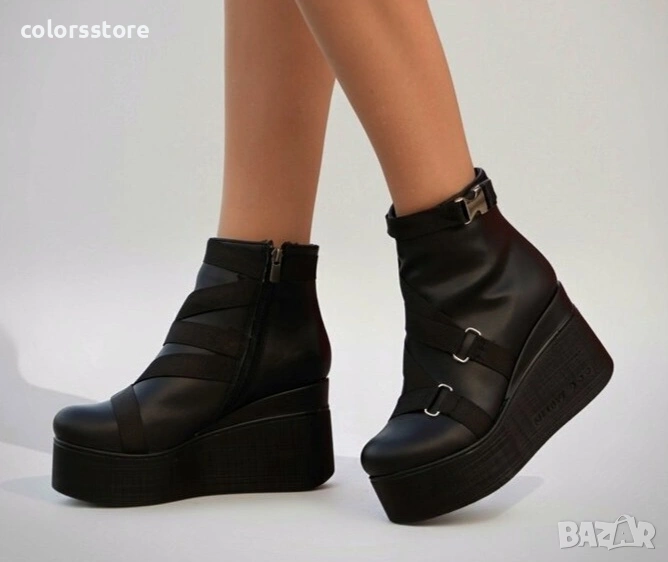 Боти на платформа - черна кожа с бронз катарами - 135K