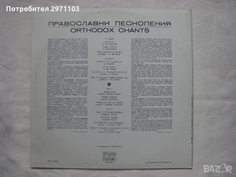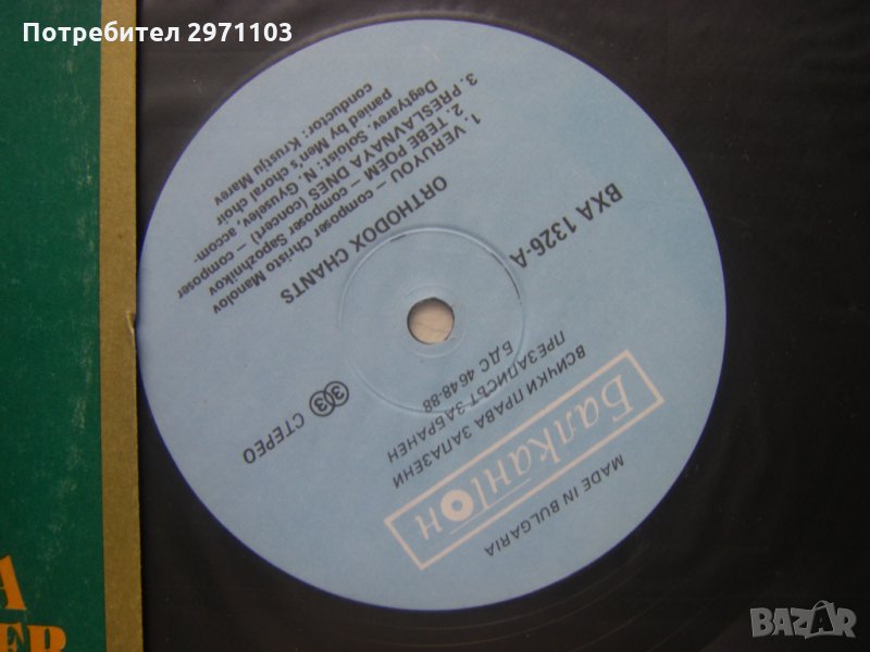 Грамофонна плоча - ВХА 1326 - Православни песнопения. Никола Гюзелев - бас с мъжки камерен хор, диригент Кръстьо Марев