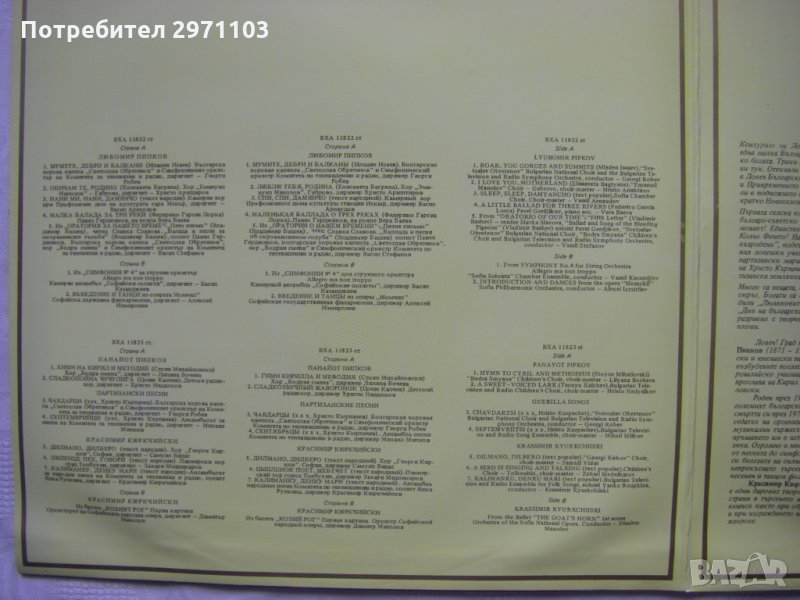 Шумете, дебри и балкани / Л. Пипков; текст Мл. Исаев; изпълняват Българска хорова капела "Светослав Обретенов" и Симфоничен оркестър при Комитета за телевизия и радио, диригент Г. Робев. Обичам те, Родино / текст Ел. Багряна; изпълнява Хор "Емануил Манолов" - Габрово, диригент Хр. Арищиров. Нани ми, нани, Дамянчо: текст народен / изпълнява Камерен хор при Профсъюзен дом на културата - гара Искър, диригент В. Арнаудов. Малка балада за три реки / текст Ф. Гарсиа Лорка; изпълнява П. Герджиков; съпровожда на пиано В. Баева. Из Оратория за нашето време / текст Вл. Башев: Пето писмо / четец Сл. Славова. Балада и песен за за окървавените гълъби / солист П. Герджиков; изпълнява Българска хорова капела "Светослав Обретенов", Хор "Бодра смяна" и Симфоничен оркестър при Комитета за телевизия и радио, диригент В. Стефанов. Из Симфония No 4 / изпълнява Камерен ансамбъл "Софийски солисти", диригент В. Казанджиев. Въведение и танци из операта Момчил / изпълнява Софийска държавна филхармония, диригент Ал. Измирлиев. Химн на Кирил и Методий / П. Пипков; текст Ст. Михайловски; изпълнява Хор "Бодра смяна", диригент Л. Бочева. Сладкопойна чучулига / текст Ц. Калчев; изпълнява Детски радиохор, диригент Хр. Недялков. Партизански песни: Чавдарци / текст Хр. Кърпачев; изпълнява Българска хорова капела "Светослав Обретенов" и Симфоничен оркестър при Комитета за телевизия и радио, диригент Г. Робев. Септемврийци / текст Хр. Кърпачев; изпълнява Ансамбъл за песни при Комитета за телевизия и радио, диригент М. Милков. Дилмано, Дилберо: текст народен / Кр. Кюркчийски; изпълнява Хор "Георги Кирков" - София, диригент С. Видас. Пиленце пее, говори: текст народен / изпълнява Пионерски хор - гр. Толбухин, диригент З. Медникаров. Калиманку, Денку мари: текст народен / изпълнява Ансамбъл за народни песни при Комитета за телевизия и радио; солистка Я. Рупкина; диригент Кр. Кюркчийски. Из балета Козият рог, 1-ва картина / изпълнява Оркестър на Софийска народна опера, диригент Д. Манолов