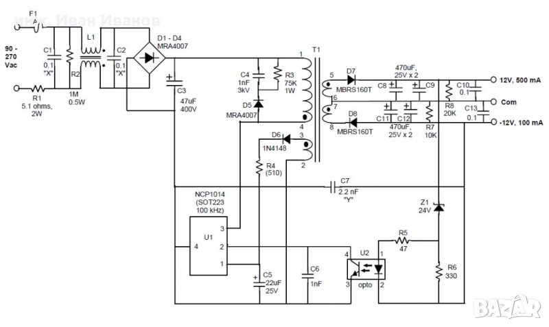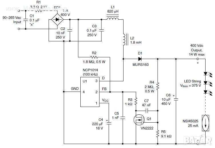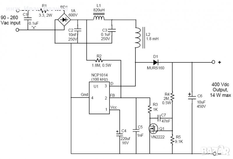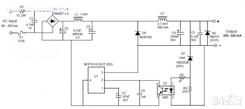 Коментар: Контролер за импулсни захранвания с вграден високоволтов 700V MOSFET транзистор и минимален брой периферни елементи. По-просто няма как да е...