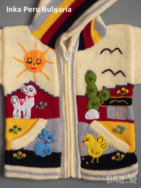 Известни в Перу с името Chompas Arpilleras, жилетките са ръчно изработени от занаятчии от коренното население на перуанските Анди, от древните култури Аймара и Кечуа. Изобразяват сцени от перуанската природа както отпред, така и отзад на дрехата. Слънцето свети в планините, а лами и пилета се хранят в подножието. Всеки детайл е ръчно зашит и завършен, за да се създаде 3-D ефект. Можем да Ви предложим широка гама от цветове за момчета и момичета, както и избор от размери от 0 до 7 години.