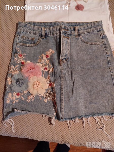 Тениска с дънкена пола нови с бродери талия 38см ханш 48см дълга е 40см няма еластичност