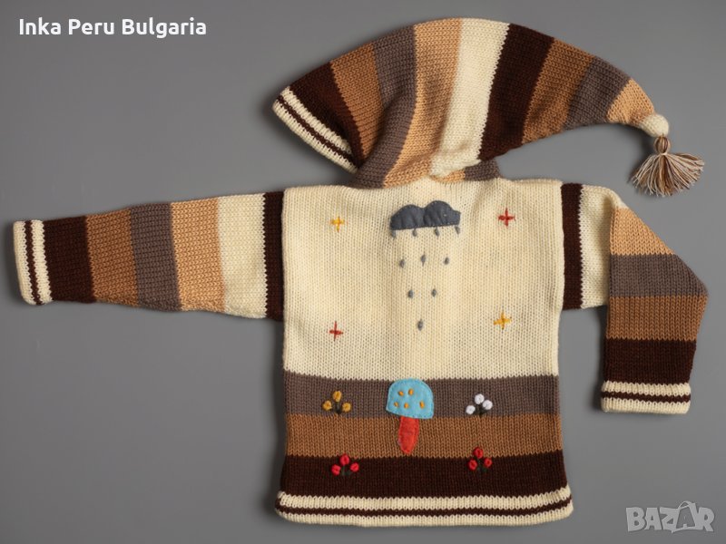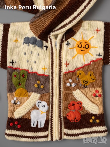 Известни в Перу с името Chompas Arpilleras, жилетките са ръчно изработени от занаятчии от коренното население на перуанските Анди, от древните култури Аймара и Кечуа. Изобразяват сцени от перуанската природа както отпред, така и отзад на дрехата. Слънцето свети в планините, а лами и пилета се хранят в подножието. Всеки детайл е ръчно зашит и завършен, за да се създаде 3-D ефект. Можем да Ви предложим широка гама от цветове за момчета и момичета, както и избор от размери от 0 до 7 години.