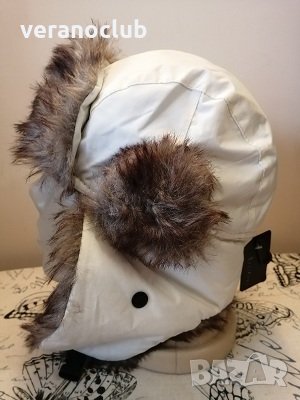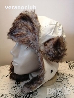 Мъжка бяла шушлякова ушанка. Шапката е с размер 57/58 см. Покрива добре ушите. Изработена е от бял непропусклив шушляков материал и еко косъм с кафеникав оттенък. Отвътре е с подплата.