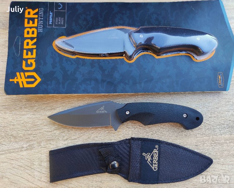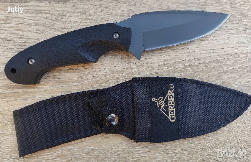 Gerber Drop Point е фиксиран нож с неплъзгаща се дръжка с гумена ръкохватка и с титановосиво покритие.