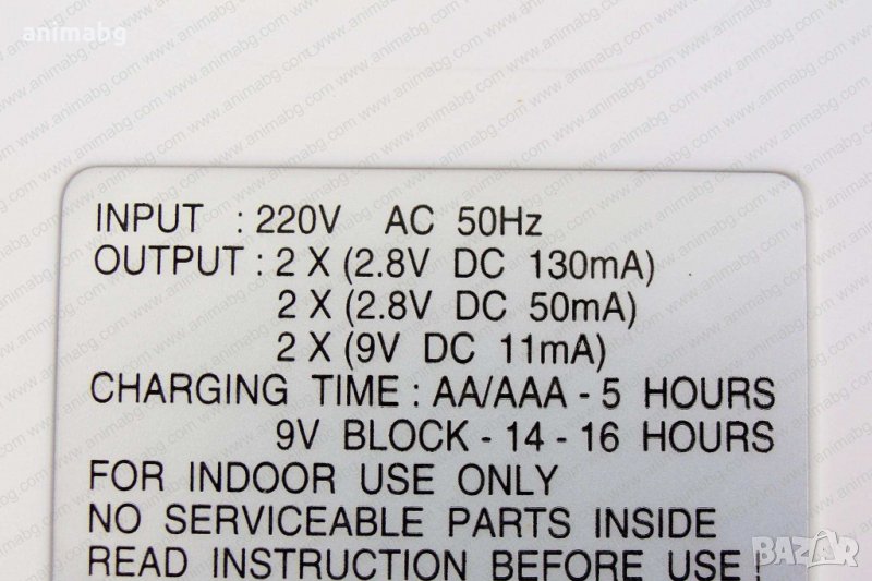 Charging current: AA/130mA, AAA/50mA, 9V/11mA