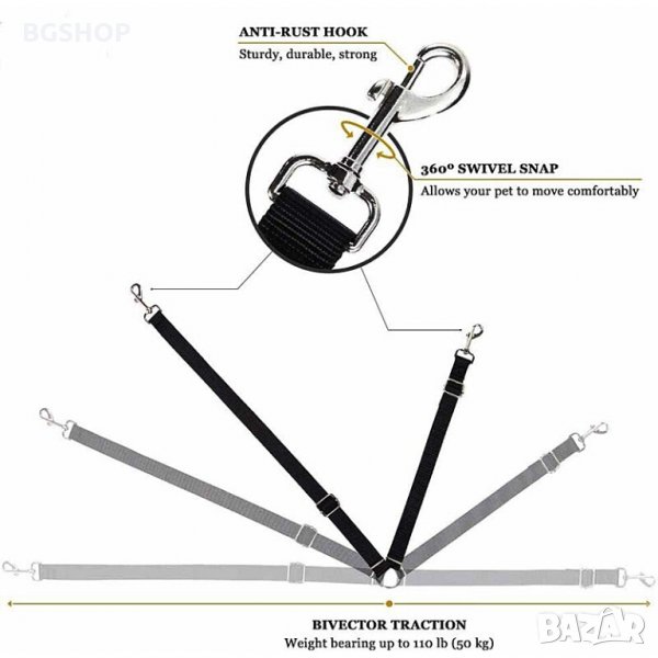 Единият край се закрепва на мястото на предпазния колан, а другият към нагръдника на домашния любимец.