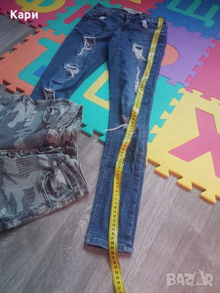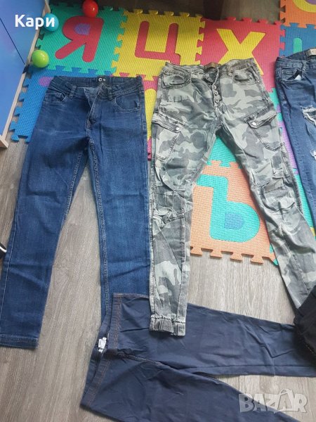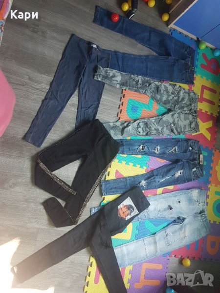 Много хубави и запазени дънки размер С,светли,тъмни сини ,черни и зелен маскировъчен спортен панталон плат като дънки(има забележка на едното коляно малко кафяви черти на 9та снимка,еластични освен най-светлите дънки,размер в см на снимките има,2броя клинове има те са продадени на 4та снимка