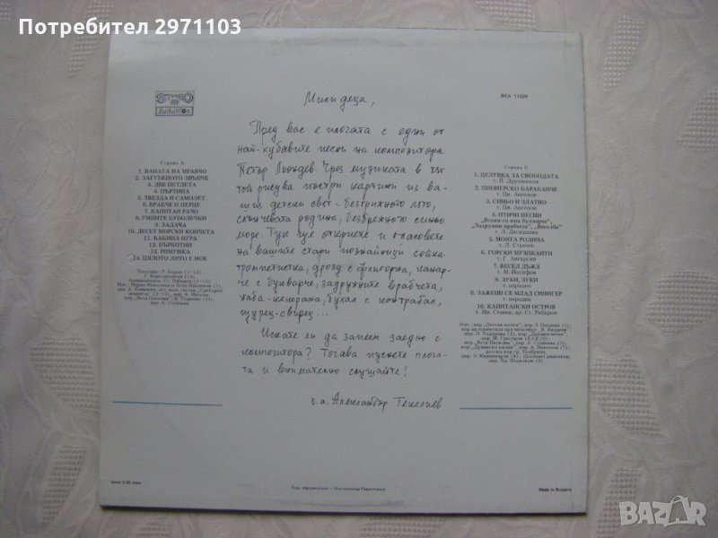 Изп.: Мария Николова и Ясен Найденов (1), дир А. Ковачева, дет. вок. състав "Сребърни звьнчета” (2—13), дир. А. Милева, хор „Вела Пискова", В. Търново (14), дир. А. Стойчева