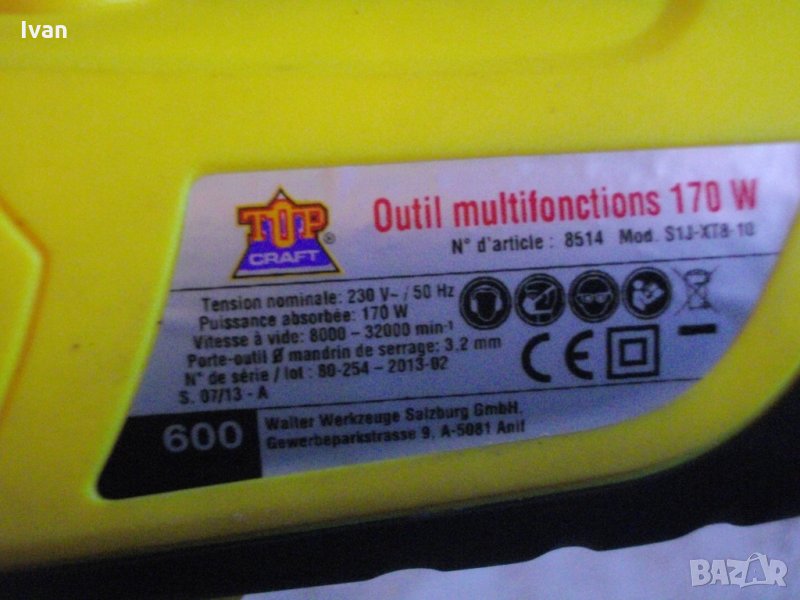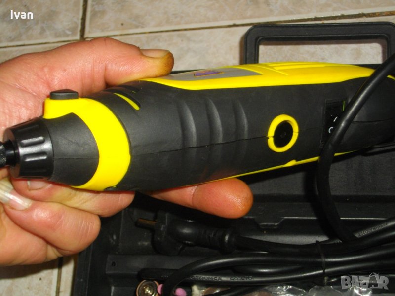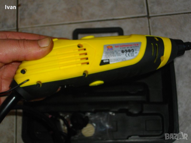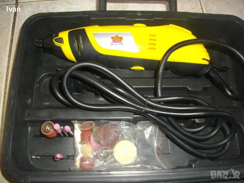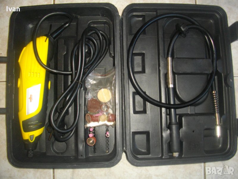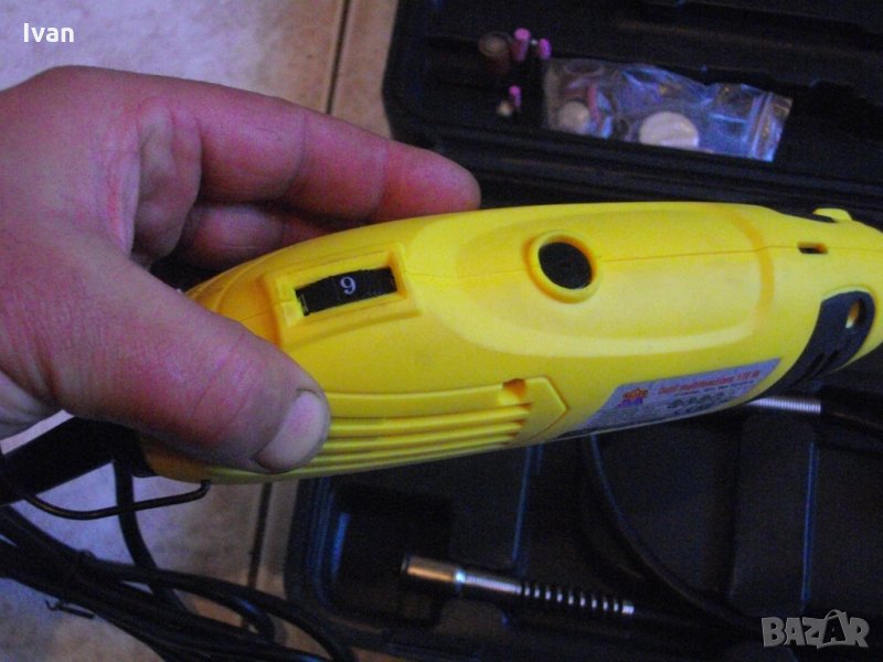 Мощност на машината-170 вата,обороти-от 8 000 до 32 000 в минута,регулируеми с 7 степени / не работят - машината работи само на максимална скорост/ .Четки-външни.Патронник-ф3,2 мм.Гумирано нехлъзгащо се покритие на корпуса.Удобен долен пусков ключ.В компонентите има шкурки,шлифовалки, шмергелов малък камък. Машината е прибрана в оригиналният си твърдосплавен куфар с фабричното лого.В комплектите има и оригиналното гъвкаво рамо,с цанга отпред,сменяема.