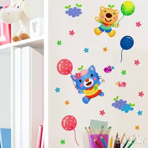 Пъстър въздушен Аеро балон с балончета и слонче детски самозалепващ стикер лепенки за стена детска → Обява 35560736