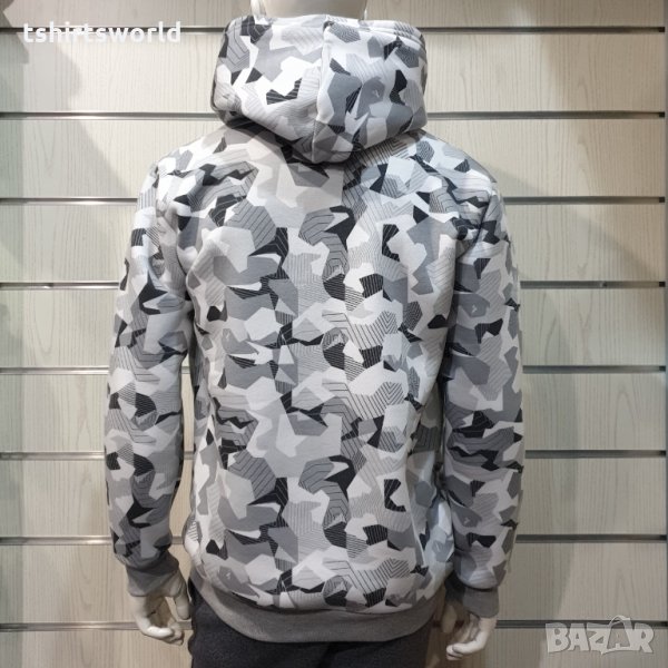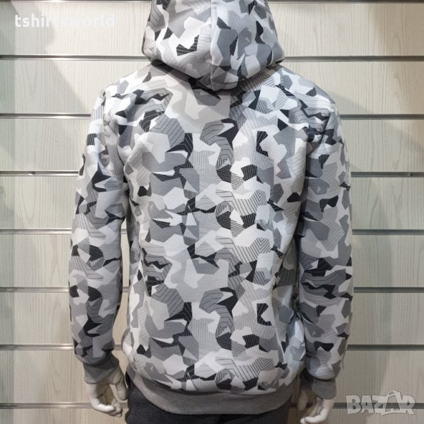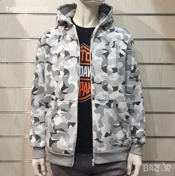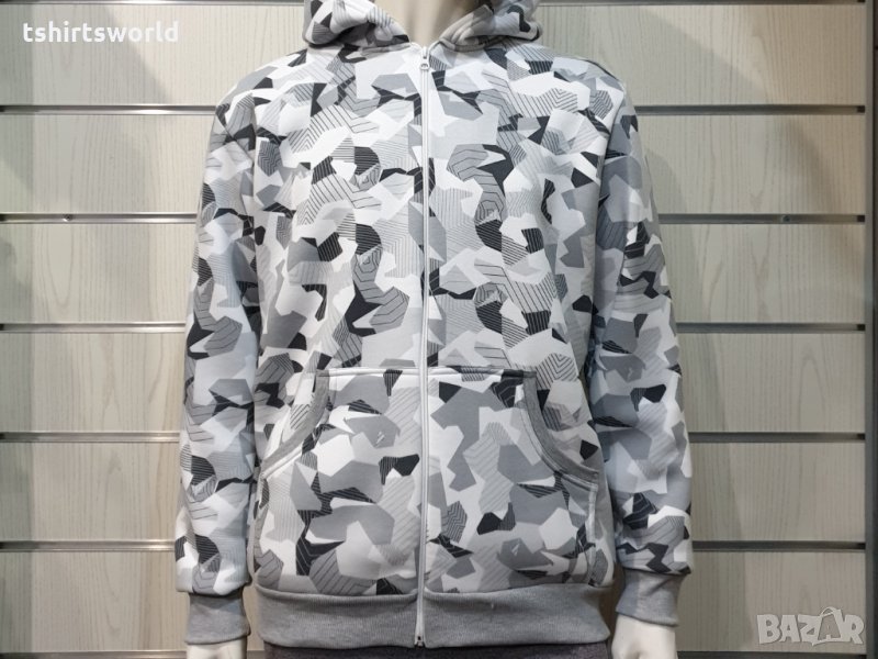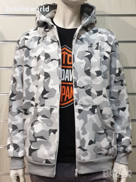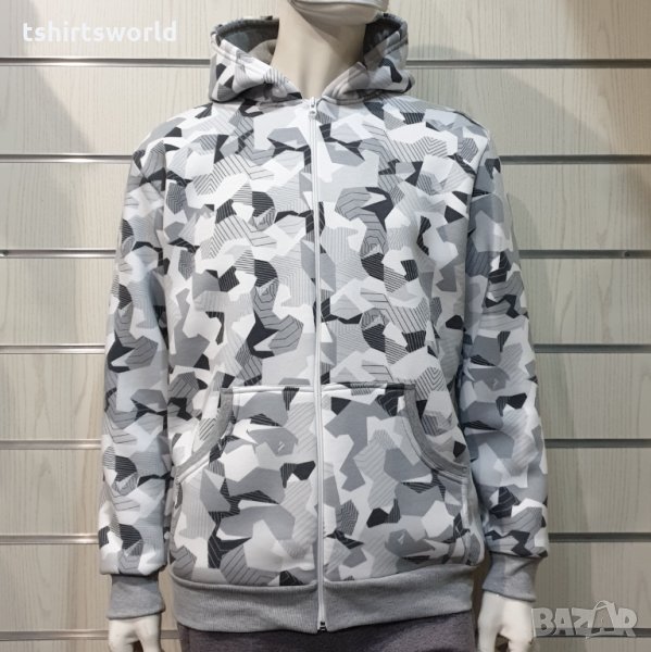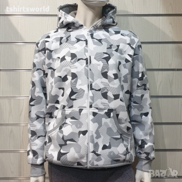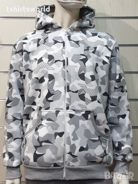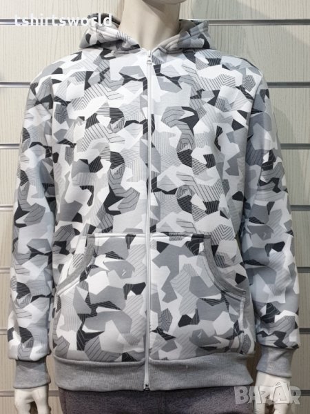 Страхотен нов мъжки камуфлажен суичър с цип, качулка и две джобчета. Произведен в България под марката PRINTEX от висококачествен 100% памук - триконечна пенирана вата с кардировка, което го прави изключително топъл и желан от нашите дългогодишни клиенти. Моделът е подходящ за пролетния и есенно-зимният сезон, има ластични маншети на китките и ханша, запазващи топлината. Разполага с мека подплата и два отворени джоба в страни. Свободната кройка го прави подходящ както за спорт, така и за ежедневно носене с дънкови панталони. Марката PRINTEX от години се слави със своите топли и качествени суичъри.