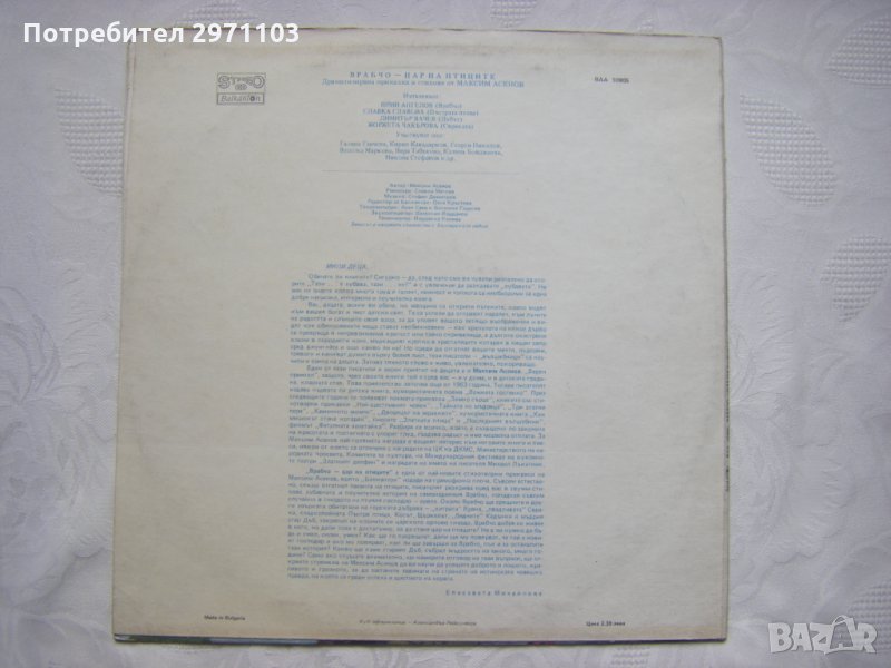Грамофонна плоча - ВАА 10905 - Врабчо - цар на птиците (Максим Асенов)