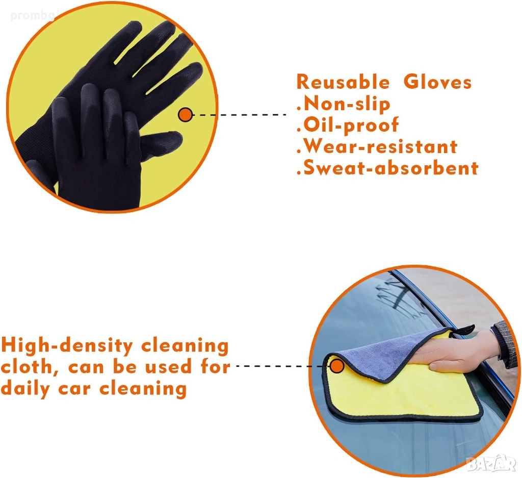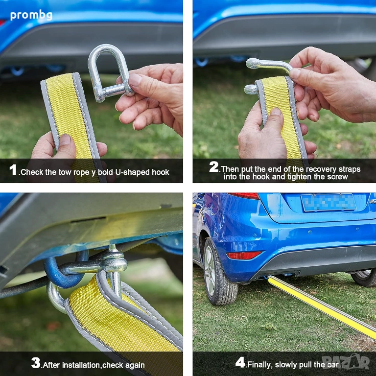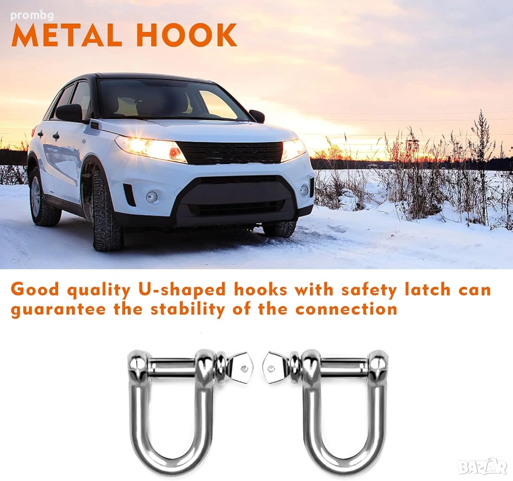 Здраво въже за теглене със светлоотразителна ивица/лента. Внос от Германия. С две дебели U-образни куки с д.5м x ш.5см. В комплект с ръкавици и двустранни кърпи за почистване.