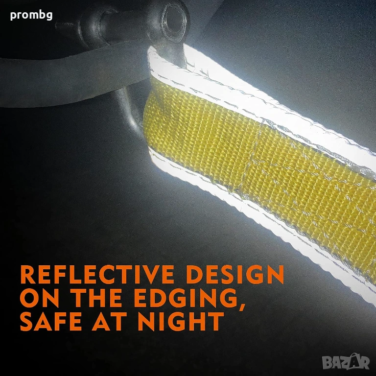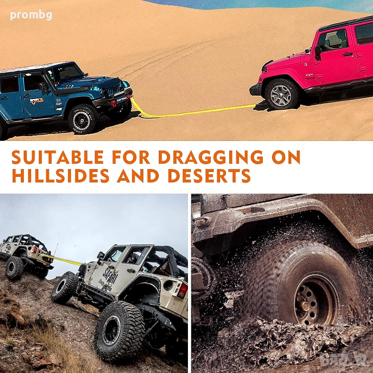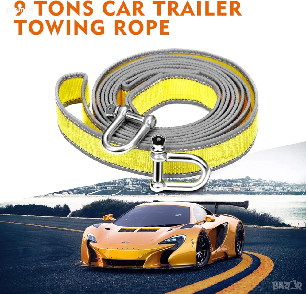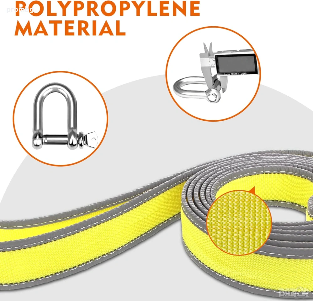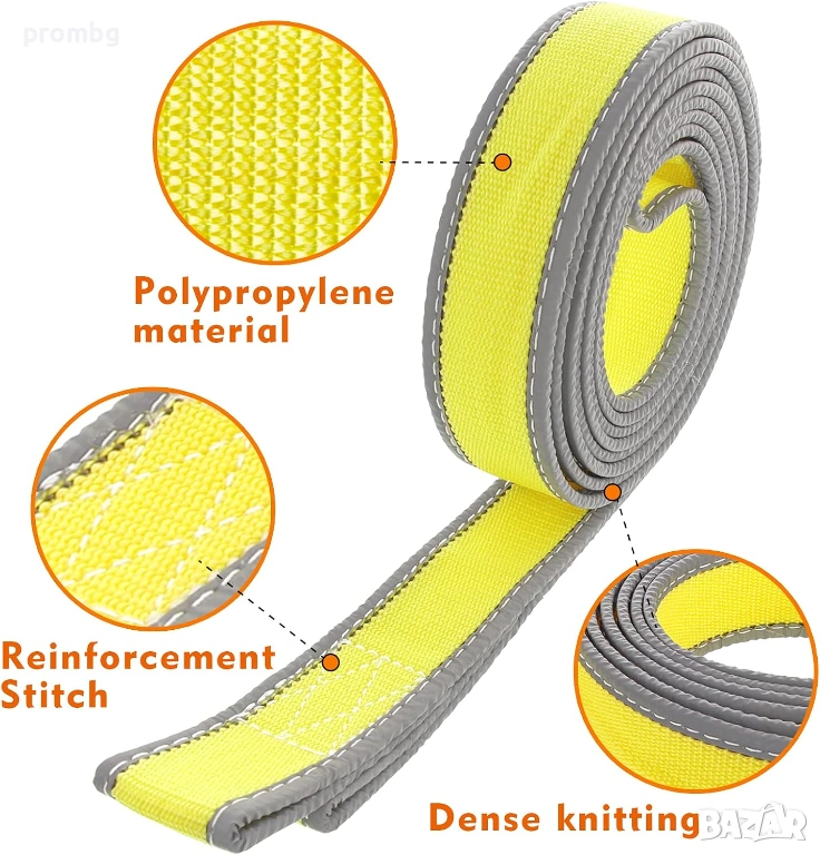 Изключително здраво с теглещ капацитет до 9 тона, изработено от полипропиленов материал с добра здравина и устойчивост. Въжето е снабдено със светлоотразителни платнени ленти, което гарантира безопастност в тъмното. Приложение: за превозни средства, спасителни операции, за преместване на тежки предмети и др.