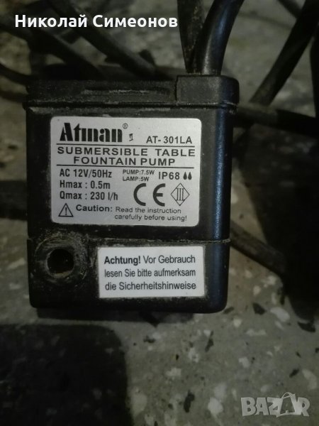 Захранващ траф 220/12в.,помпичка за вода,лампичка и ключе за пуск-стоп на декоративно водно фонтанче.Водосъ-