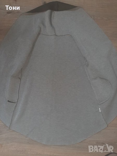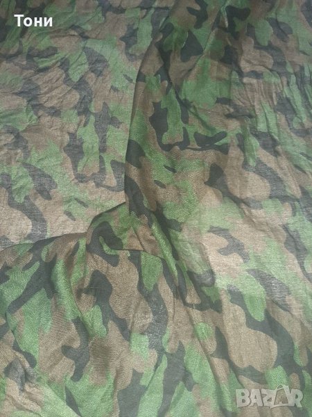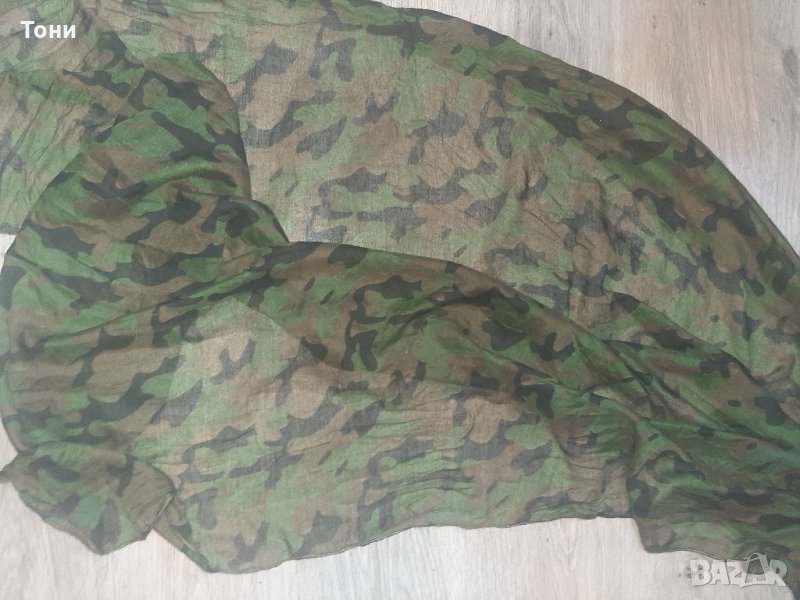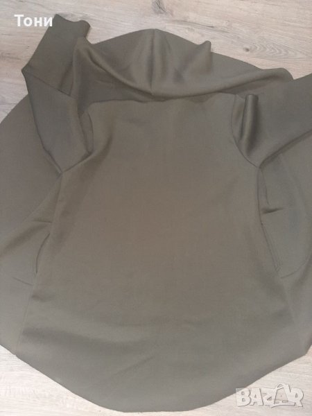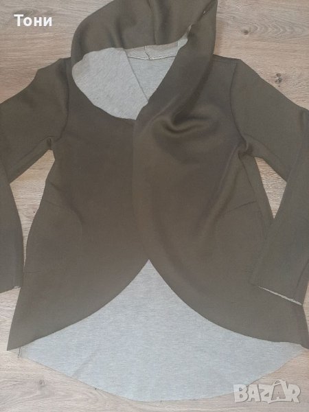 Дамски асиметричен анорак с качулка. Цвят маслено зелен. Вътрешната част е в сиво.Два външни джоба, не се закопчава. Стои свободно, подходящ за размер от М, Л,ХЛ. В комплект с камуфлажен шал.Няма забележки.
