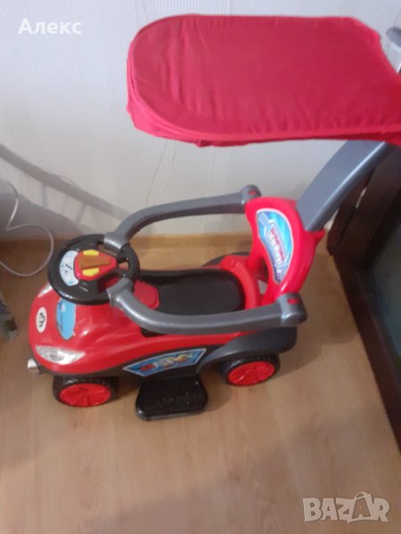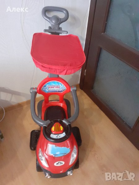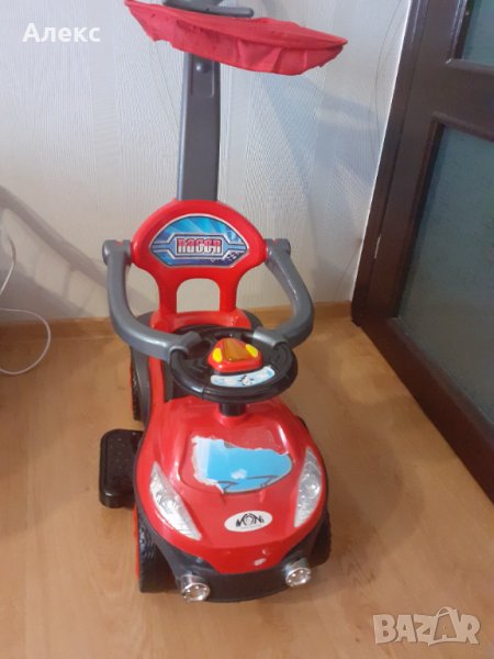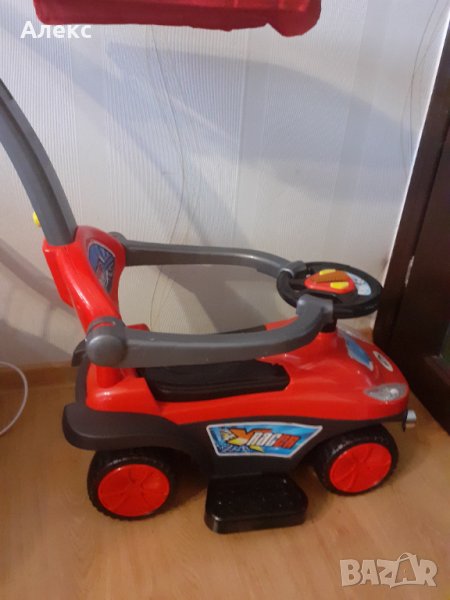 Музикална кола за каране с крачета,със свалящ се сенник,дръжка за родителски контрол поставка за крачета за по-малки деца,която при нужда може да се маха.Предпазен борд и място за съхранение на играчки под седалката.Количката е карана само в къщи и е изключително здрава, без драскотини и забележки.Единствената забележка е скъсана картинка отпред вижда се на снимките.