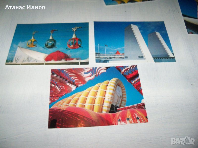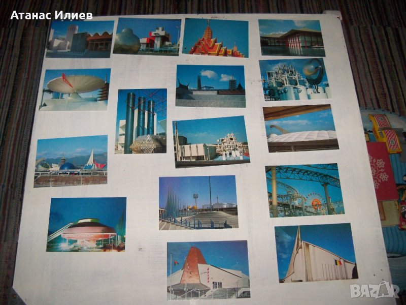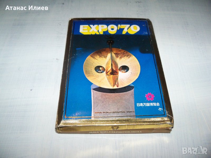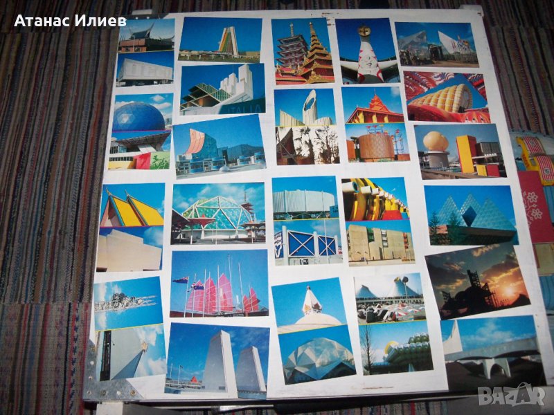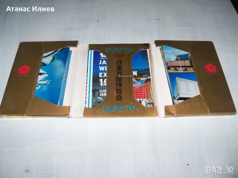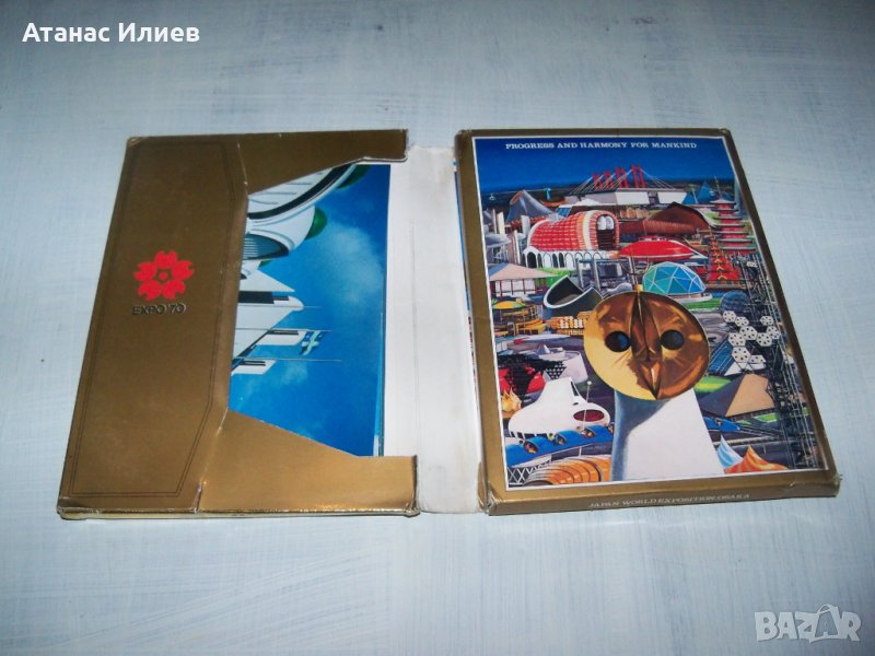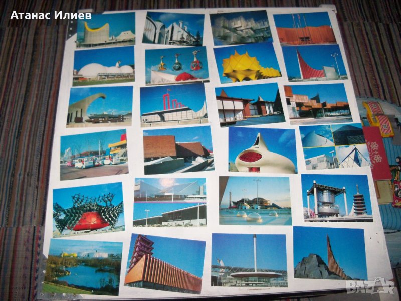 Страхотни японски картички от проведеното в Осака през 1970г. "Expo'70". Картичките са 64 на брой в луксозна опаковка. Картичките са в отлично състояние, опаковката е със запацапвания по предната страна. Освен тях към комплекта има и художествена карта на фестивалния град. На картичките са изобразени павилионите на страните участнички, които са с изключително футуристичен дизайн. Експото е проведено под наслов "Прогрес и хармония за човечеството" и е едно от най-значимите събития на миналия век.