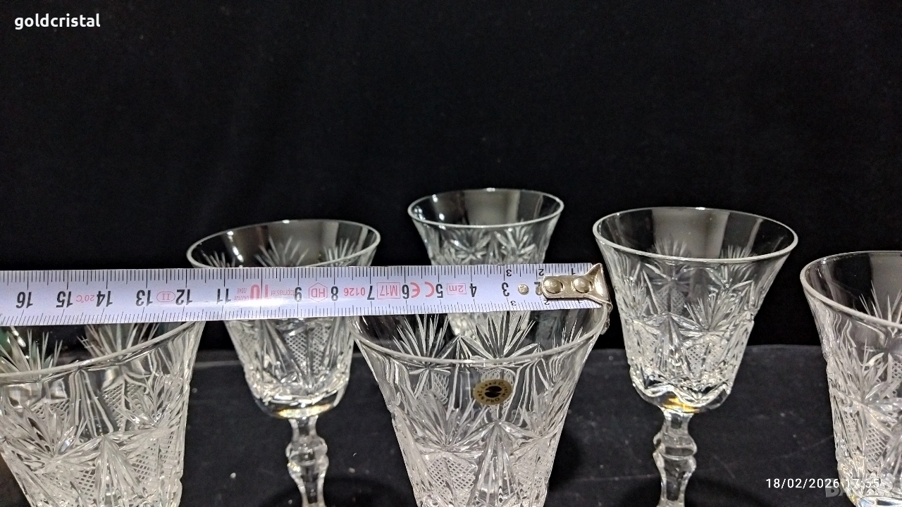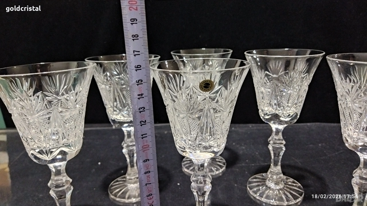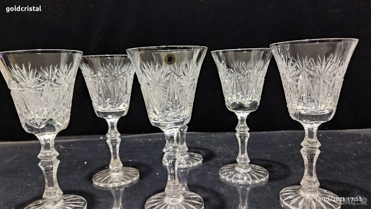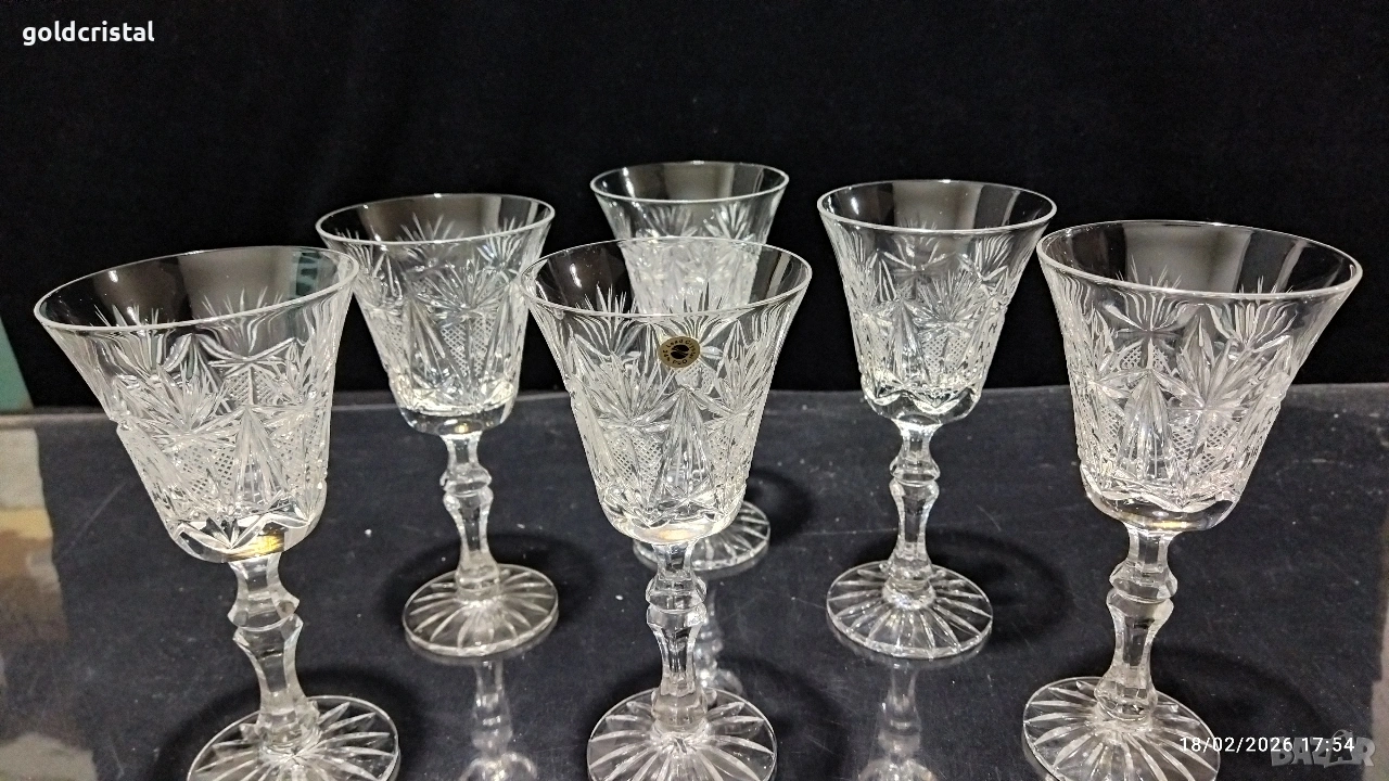 кристални чаши серия олимпия стар български кристал луксозна серия богата гравюра ръчно гравирани 6 броя за вино без забележки ръчно гравирани сервиз комплект сет лот ретро арт декор винтидж стил колекция стари антикварни предмети обзавеждане за дома и семейството подходящи за подарък за ценители и колекционери