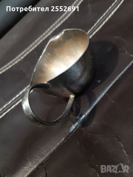 Метален, посребрен съд с дръжка и наличие на маркировка. Височина- 5см. Дължина- 10,5 см.