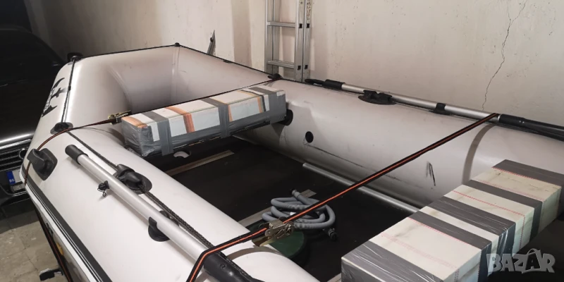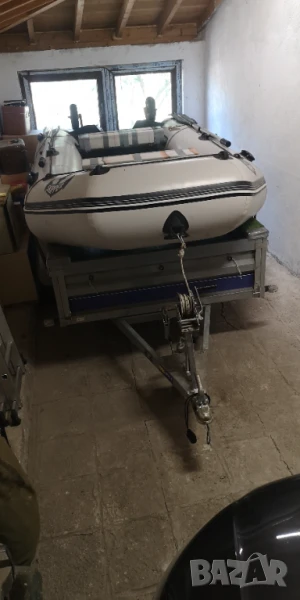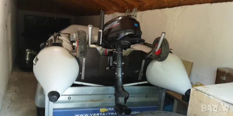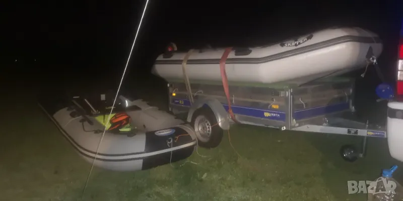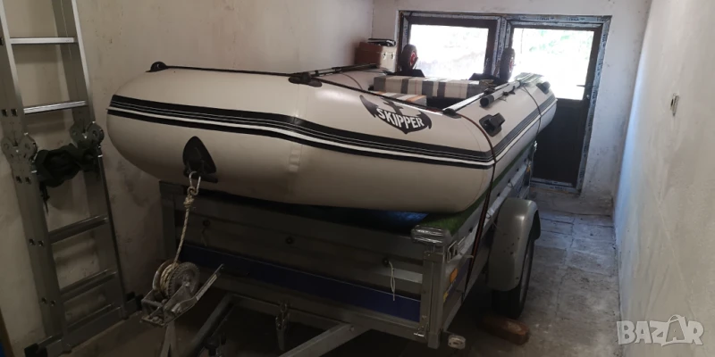 Украинска лодка Skipper от висок клас, дължина 330см., ширина 165 см (най-широката за тази и по големи дължини лодки), бордове 42см. Петпластов немски материал-1100гр. Твърдо дъно и надуваем кил. Монтирани са и неръждаеми колела със стойки за въдици. Тегло-70кг. Мотор-Bulpower, четеритактов, 6 к.с., къс ботуш, мотор на Yamaha, тих и икономичен. Върви с оригиналната опаковка. Във вода са били не повече от 3 часа. Две чанти, помпа, гребла. Ремарке Vesta Light 23, с регистрация и преглед до ноември 2026 г. Ремаркето е на 2 години и 200 км.,тип самосвал с лебедка. Използвано е три пъти и само с лодката. Монтирани са и релси на канатите за лесно качване на лодката. Възможна продажба и поотделно.