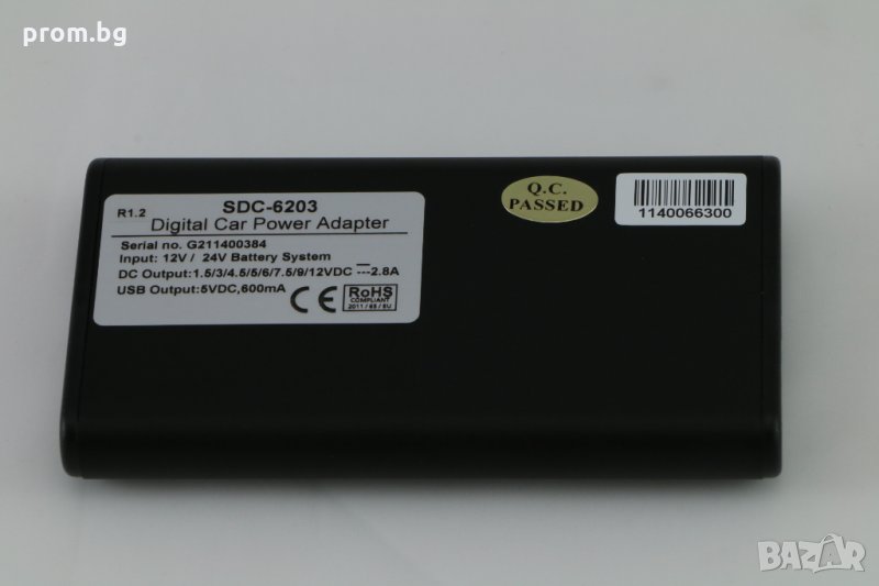 дигитално, немско зарядно за кола Manson, с USB, ново, внос от Германия. Изходно напрежение за USB 5 V DC макс. 600 mA и постоянно изходно напрежение DC 1,5 - 12 V DC. Здрав алуминиев корпус, LCD дисплей с размери 88 x16 мм, регулиране на изходното напрежение на степени. Дисплеят показва изходно напрежение, ниво на захранване и графично изображение, показващо нивото на зареждане. Зарежда смартфони и таблети с Android и IOS. Има 7 различни адаптора за захранване на различни устройства. Заряден ток до 3 А. Регулируемо изходно напрежение: 1.5 / 3 / 4.5 / 5 / 6 / 7.5 / 9 / 12 V DC. Микропроцесорно управление. Защитава автомобилната батерия от прекомерно разреждане (автоматично изключване). Входно напрежение 12 V /24 V. Има защита срещу късо съединение / претоварване, пренапрежение и прегряване. Размери: 108 x 57 x 17 мм. Тегло: 280 г. В комплекта са вкл: Зарядно устройствo, 1.5 м кабел към гнездото за запалка, 1.5 м кабел за зареждане, 7 адаптора DC, USB кабел за таблети и инструкции.
