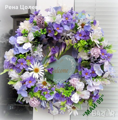 Ръчно изработен,пищен и красив венец на основа слама с изкуствени пролетни цветя в лилаво и бяло,дървено сърце с надпис WELCOME!