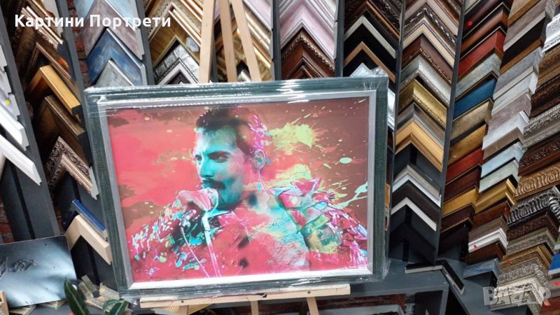 Продавам картина с рок легендата Фреди Меркюри. Красива изработка, рамкирала и опъната на подрамка. Размер 50х64 см. Латексови бои върху канаваца.